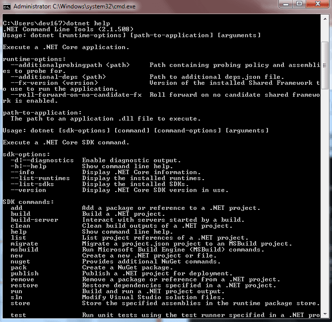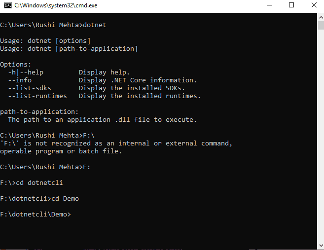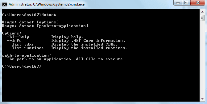 به Command prompt بروید و dotnet را تایپ کنید و کلید اینتر را بزنید. User تمام اطلاعات را دریافت میکند، همانطور که در تصویر زیر نشان داده شده است.
