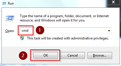 پنجره Run را با فشردن Windows + R باز کنید و cmd را در کادر پنجره باز شده تایپ کنید و دکمه OK را مطابق شکل زیر بزنید.