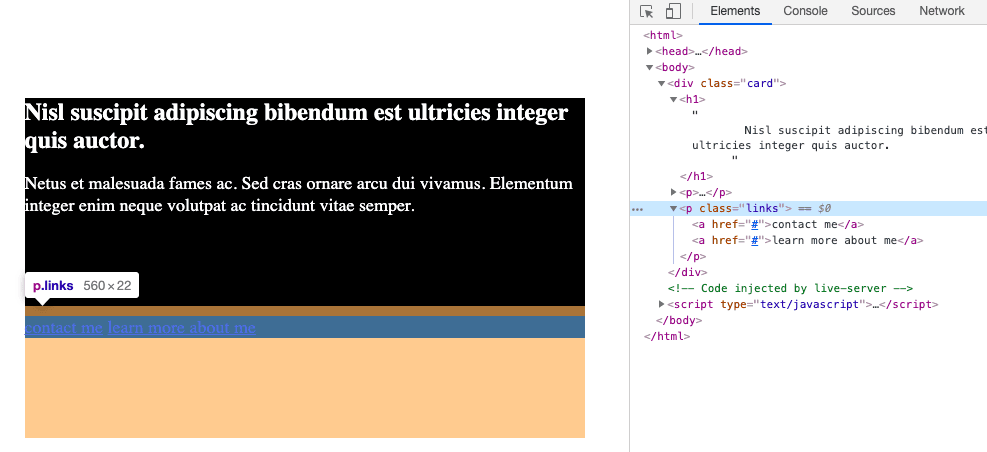 از این رو، در کد بالا ما به همه پاراگرافها یک margin-bottom دادهایم. این margin در عناصر p.link با margin-bottom عنصر card. در تماس است، که این بدان معناست که این دو با هم ادغام میشوند و margin روی عنصر card. به جای links تاثیر میگذارد.