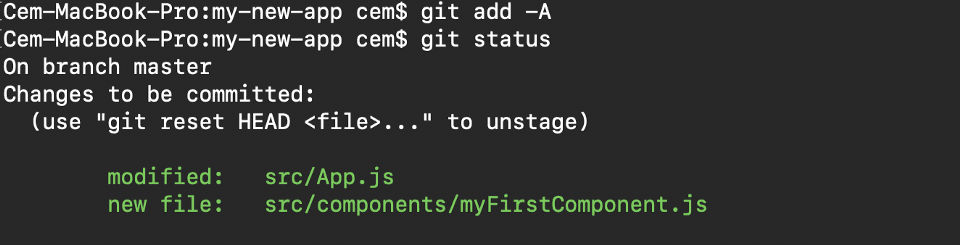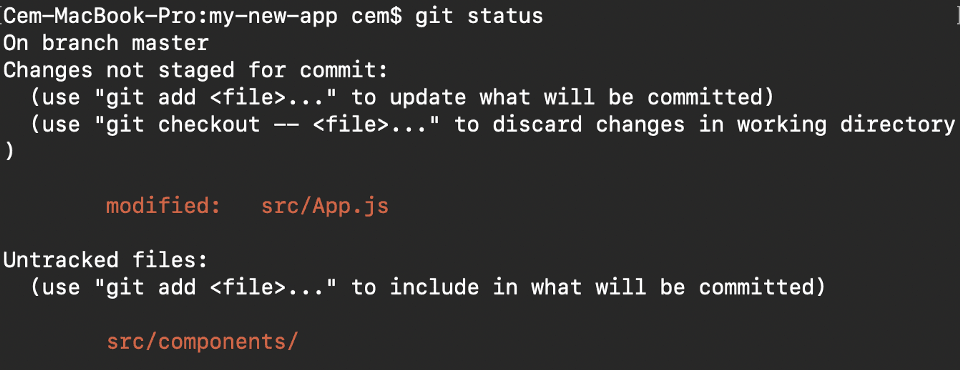 وقتی تصویر بالا در مورد چهارم را مشاهده میکنید، نام فایلهایی را میبینید که به رنگ قرمز هستند؛ این یعنی اینکه آنها فایلهای unstage هستند. فایلهای unstage در کامیتهای شما قرار نمیگیرند.