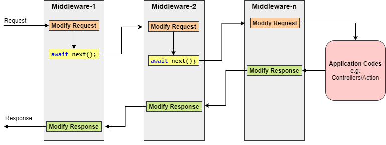 به طور کلی، هر middleware ممکن است درخواست های دریافتی را کنترل کرده و اجرا آن را برای پردازش بیشتر به middleware بعدی منتقل کند.