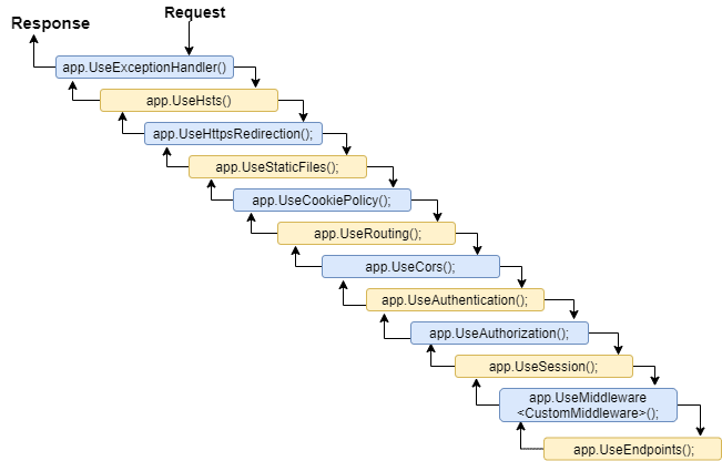 اولین middlewareپیکربندی شده درخواست را دریافت کرده، آن را اصلاح کرده (در صورت لزوم) و کنترل را به میان افزاربعدی منتقل می کند. به همین ترتیب، در صورت پردازش پاسخ، اگر echo به پایین tube بازگردد، اولین middleware در آخرین مرحله اجرا می شود. به همین دلیل است که Exception-handling delegateها اوایل pipeline فراخوانی می شوند، بنابراین می توانند نتیجه را اعتبارسنجی کنند و یک exception احتمالی را به روش مرورگر و مشتری پسند نشان دهند.