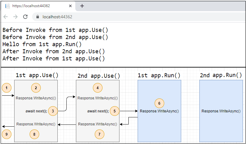 مثال زیربا app.Use() وapp.Run() را بررسی کنید وهمچنین output/response را مشاهده کنید: