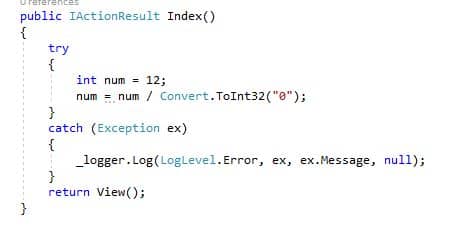 سپس باید اکسپشن را در اکشن Index تولید کرده و آن را به آبجکت ILogger لاگ کنیم.