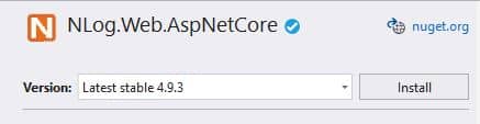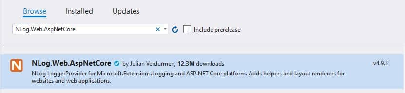 از پنجره Package Manager، پکیج NLog.Web.AspNetCore NuGet را جستجو میکنیم، همانطور که در تصویر زیر نشان داده شده است.