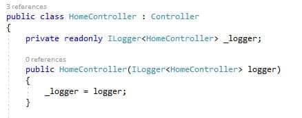 بنابراین ما میتوانیم نوع ILogger را از طریق سازنده HomeController خود تزریق کنیم، همانطور که در تصویر زیر نشان داده شده است.