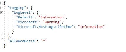 در زیر کانفیگ پیشفرض لاگ است که ویژوال استودیو هنگام ایجاد پروژه جدید در فایل appsettings.json ایجاد میکند. شما میتوانید طبق نیاز خود این log level را تغییر دهید.
