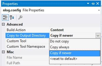 در زمان build این فایل کانفیگ باید در پوشه Output کپی شود. برای انجام این کار، در سولوشن بر روی فایل nlog.config کلیک راست کرده و " Properties" را انتخاب کنید.