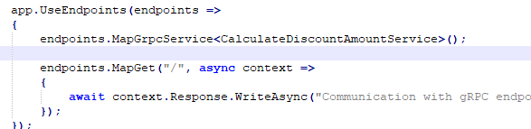 این شامل تابع AmountCalculate است که پیاده سازی تعریف rpc در فایل proto. و انواع CalculateReply و CalculateRequest به عنوان نوع بازگشتی و پارامتر request که به عنوان نوع پیام تعریف شده است میباشد. همچنین فایل Startup.cs را برای مپ کردن کلاس CalculateDiscountAmountService به عنوان سرویس gRPC، همانند زیر آپدیت کنید: