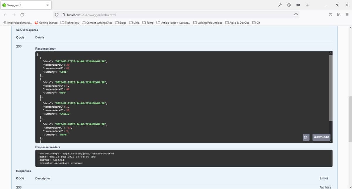 در نهایت شما می توانید با مشخص کردن رمز احراز هویت همان endpoint را مجددا در رابط کاربری Swagger اجرا کنید. endpoint در این مرحله به درستی کار می کند و شما می توانید خروجی آن را در رابط کاربری Swagger به راحتی مشاهده کنید.
