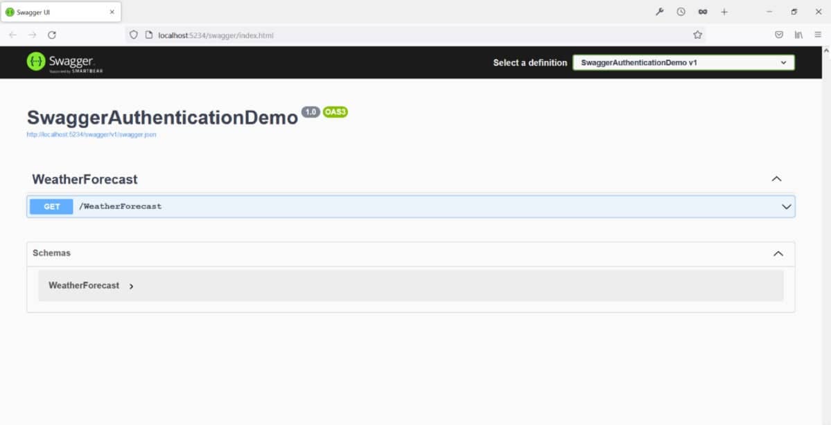 همانطور که می توانید مشاهده کنید رابط کاربری Swagger کنترل کننده WeatherForecast که در زمان ساخت پروژه در ASP.NET core 6 به صورت پیش فرض ایجاد می شود را به شما نمایش می دهد. در این پروژه اعتبارسنجی برای Swagger تنها یک متد HttpGet action وجود دارد.