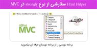 Html Helper سفارشی در MVC Html Helper سفارشی در MVC در این مقاله می خواهیم در مورد html helper سفارشی صحبت نماییم، و در مورد این موضوع یک نمونه قرار دهیم، html helper ها متدهایی هستند که در syntax های razor به کار می رود و مورد استفاده خواهد بود. ASP.net MVC 1394/12/11 برنامه نویسان 2560