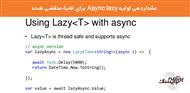 مقداردهی اولیه Async lazy برای اشیاءمنقضی شده مقداردهی اولیه Async lazy برای اشیاءمنقضی شده ، به عنوان بخشی از Net Framework. ما <Lazy<T را داریم ، که حمایتی را برای به تعویق انداختن ایجاد منابع بزرگ و یا منابع فشرده ، فراهم میآورد . حال اگر شی برای ایجاد شدن نیاز به عملیات async داشت ، و اگر مقدار آن بعد از یک مدت منقضی شد ، دوباره نیاز به یکسری انجام محاسبات دارد . که این یک مشکل است ، در این مقاله ما به ارائه راه حلی برای حل این مشکل خواهیم پرداخت . ASP.net MVC 1395/09/26 برنامه نویسان 1976